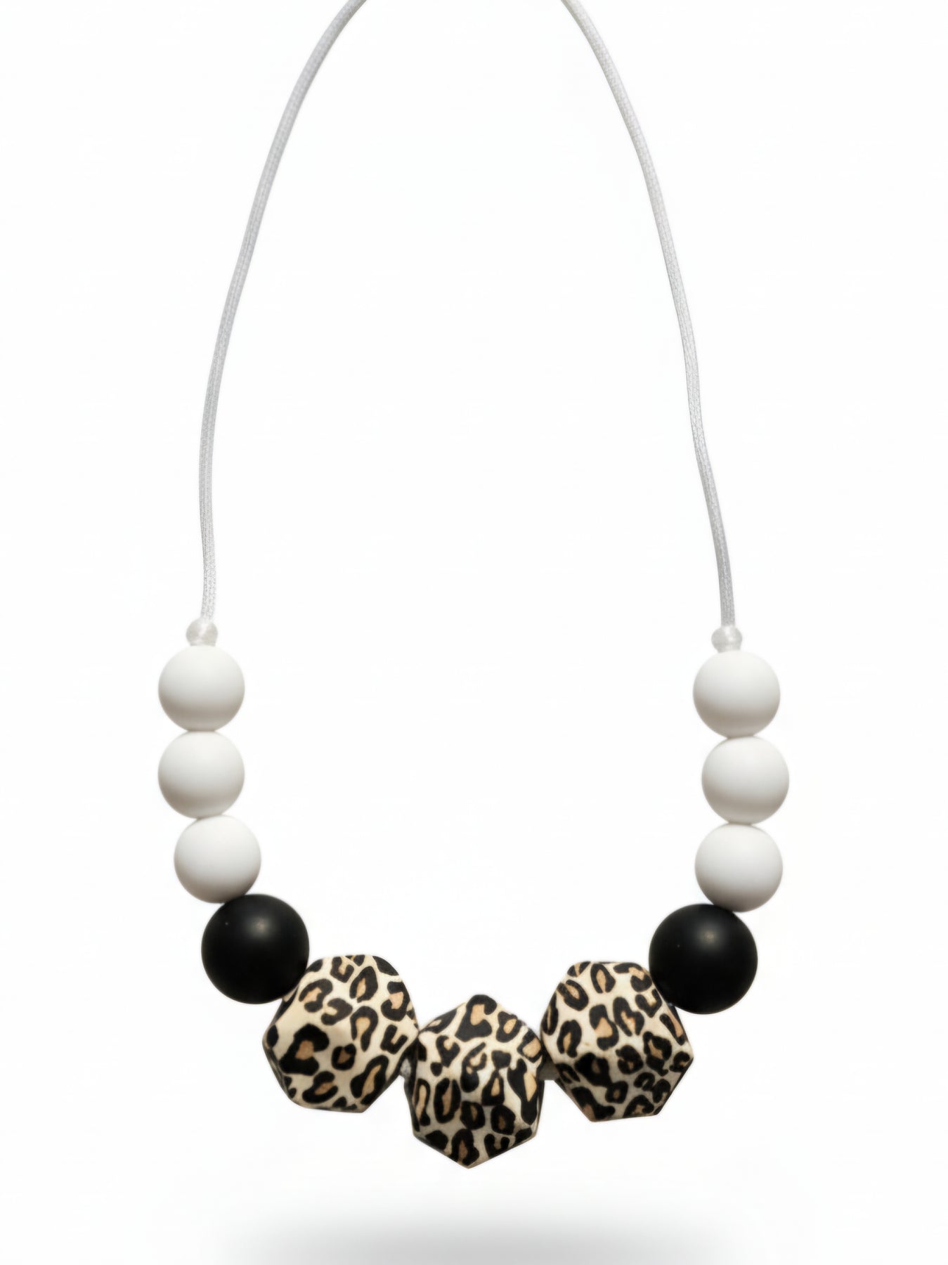 Necklace doubles as a teether while you are holding your baby and they are fishing for something to grab and bite. Instead of biting on beads treated with chemicals or paint/lacquer, they can bite on this baby-safe piece.